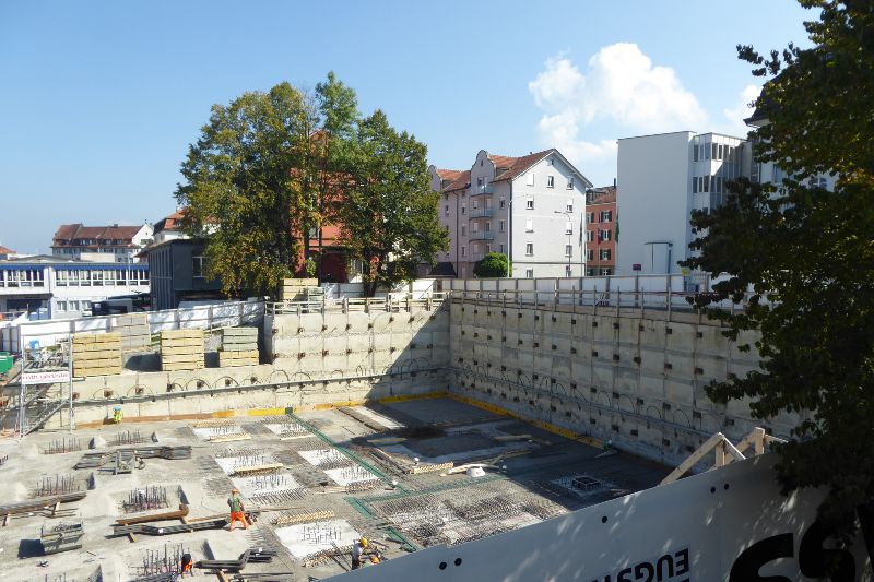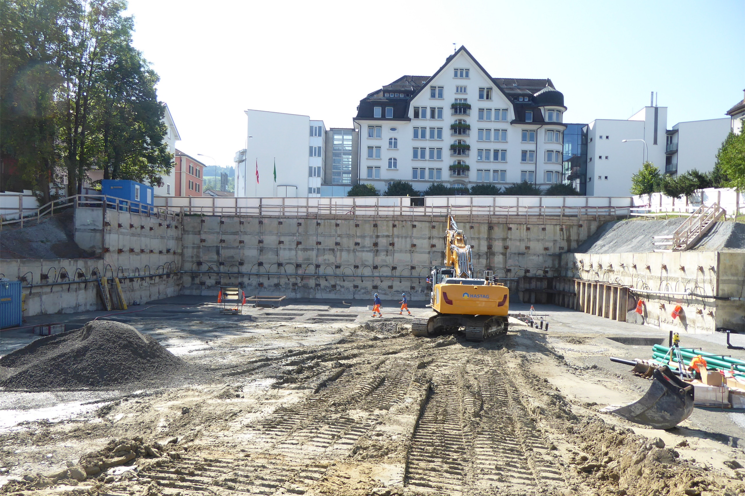 Die Überbauung Lindenpark in St. Gallen umfasst den Neubau von 5 Gebäudekomplexen, welche bis zu 9 Geschosse aufweisen und über eine doppelstöckige Tiefgarage miteinander verbunden sind. Hangseitig bindet das Bauvorhaben über 3 Geschosse ins bestehende Terrain ein. Die Baugrube wird dort über rückverankerte und lokal gespriesste Rühlwande als temporäre Sicherungsmassnahmen stabilisiert. Talseitig grenzt das Bauvorhaben an die Galeriestrecke der Nationalstrasse. Die Einbindung reduziert sich dort auf ein Geschoss. Aufgrund der gegen die A1 ungünstiger werdenden Untergrundverhältnisse wurden 2 der 5 Gebäudekomplexe über grosskalibrige Pfähle fundiert. Die bestehenden Bauten wurden vorgängig rückgebaut und das belastete Aushubmaterial VVEA-konform entsorgt.
